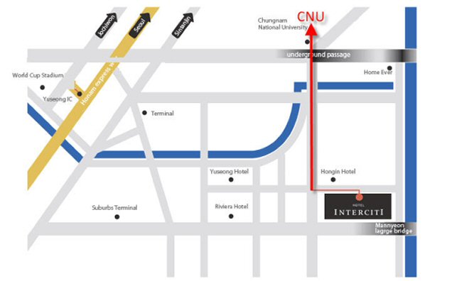 - Option 3: Take a taxi from Hotel Interciti to CNU : fare ca. 4,000 KRW to the Moon-Won Hall, CNU