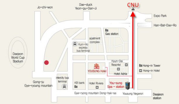 - Option 3: Take a taxi from Yousung Hotel to CNU : fare ca. 3,000 KRW to the Moon-Won Hall, CNU